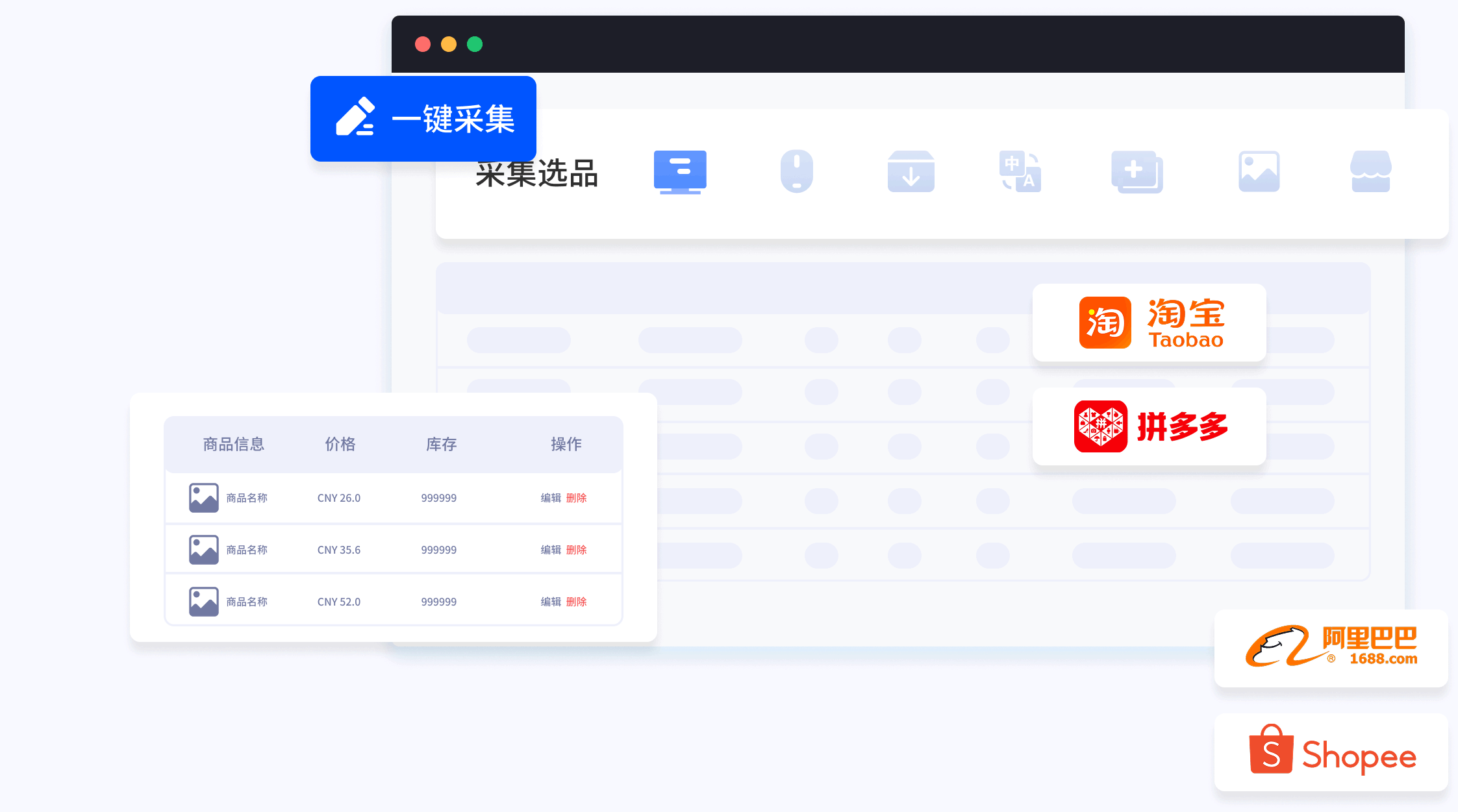 支持1688,淘宝,拼多多,shopee等货源平台商品